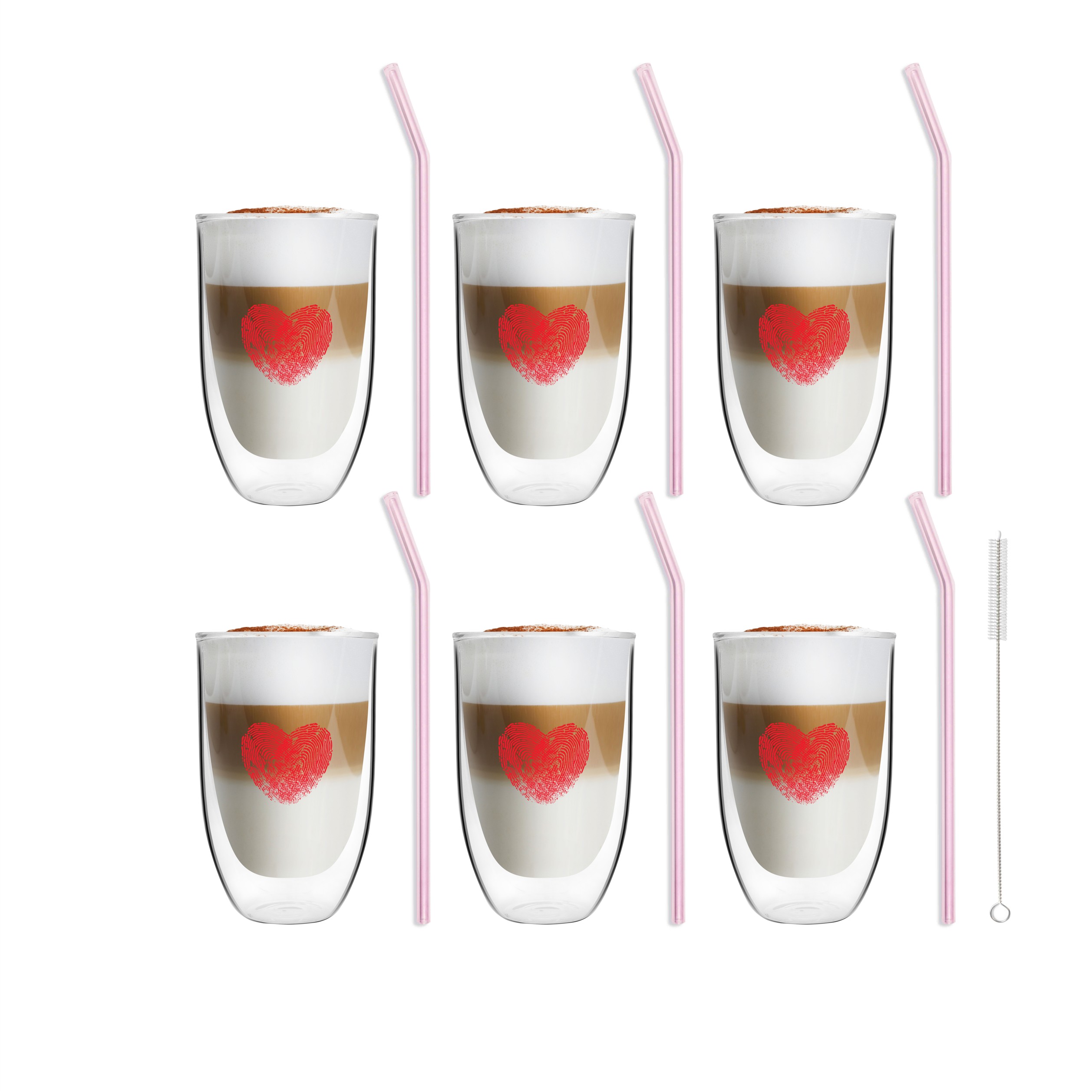 / Zestaw 6 szklanek Vita Heart 300ml i 6 słomek szklanych 23cm różowych 7237